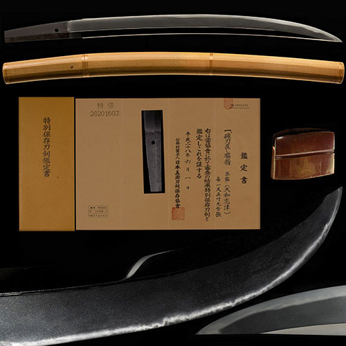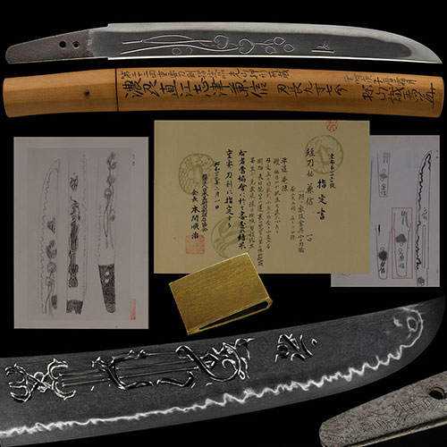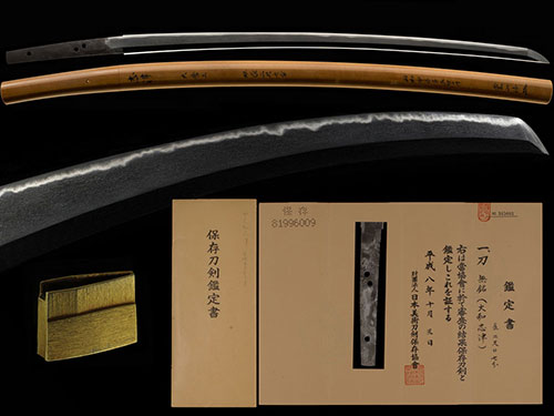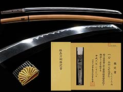 この刀は、天文頃の兼氏で、身幅広く、腰反り付き、先幅広く、鋒やや延びる姿で、杢目肌に小杢目肌交じる清涼な地鉄に、地沸微塵に厚く付き明るく冴え、互の目に、丁子刃・尖刃など交じり、飛び焼き掛り、足・葉入り、華やかに乱れ、匂口明るく冴える傑作である。Saburo Kaneuji Shizu was a swordsmith of the Yamato Tegaki school, and was originally called the Bao clan, but later changed his name to Kaneuji when he moved to Shizu, Tage-gun, Mino Province (now Shizu, Nanno-cho, Kaizu City, Gifu Prefecture). inform. However, Bao's inscriptions can only be seen that are older than the first Kaneuji, and all the things that are considered to be Kaneuji's doujinshi are unsigned. Regarding Kaneuji's teaching, he has been counted as one of the ten philosophers of Masamune since ancient times as a master of Masamune. That name continued until the late Muromachi period.