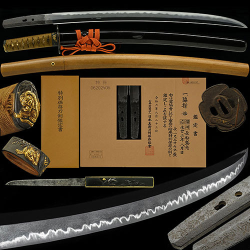 - 舞草(もぐさ)鍛冶は、平安中期に陸奥で起こった反乱討伐の前九年の役、五三年の役の後より、寛治元年(1087年)頃から奥州藤原氏の繁栄の元で、平泉で名工を輩出しており、古備前正恒の父も舞草鍛冶であったとという。舞草鍛冶には、在銘作が非常に少なく、在銘作が現存しているのは宝寿のみとなる。宝寿は、舞草鍛冶の代表工で、平安末期に源義経を育てた藤原秀衡の頃から鎌倉時代にかけて平泉で活躍した。この刀は、磨上てなお二尺六寸を超える長さに、身幅広く、腰反り・踏ん張り付き、鋒小さくなる時代の上がる豪壮な太刀姿で、宝寿の特色である肌立った地鉄に、小乱れ・小互の目交じり、小足・葉頻りに入り、小沸深くつき、金筋砂流し頻りに掛り、匂口明るい覇気溢れる傑作である。舞草(もぐさ)鍛冶は、平安中期に陸奥で起こった反乱討伐の前九年の役、五三年の役の後より、寛治元年(1087年)頃から奥州藤原氏の繁栄の元で、平泉で名工を輩出しており、古備前正恒の父も舞草鍛冶であったとという。舞草鍛冶には、在銘作が非常に少なく、在銘作が現存しているのは宝寿のみとなる。宝寿は、舞草鍛冶の代表工で、平安末期に源義経を育てた藤原秀衡の頃から鎌倉時代にかけて平泉で活躍した。この刀は、磨上てなお二尺六寸を超える長さに、身幅広く、腰反り・踏ん張り付き、鋒小さくなる時代の上がる豪壮な太刀姿で、宝寿の特色である肌立った地鉄に、小乱れ・小互の目交じり、小足・葉頻りに入り、小沸深くつき、金筋砂流し頻りに掛り、匂口明るい覇気溢れる傑作である。