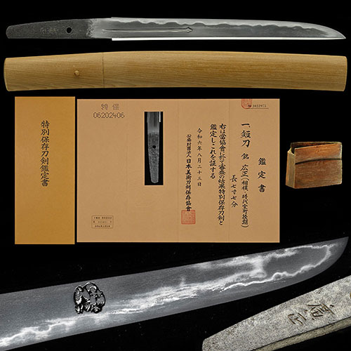 - 正広は、正宗門とも広光門とも伝え、名を九郎二郎といい、南北朝時代貞治頃から南北朝後期の年紀作がある。この刀は、身幅広く、重ね薄く、浅く反りのつく南北朝時代の典型的な姿を呈し、重ねの薄い造り込みから長谷部とも思われる作で、板目に杢目、地沸微塵に厚くつき、地景よく入り、明るい地鉄に、華やかな皆焼を焼き、足・葉頻りに入り、小沸付き、金筋・沸筋・砂流し頻りに掛り、匂口明るい傑作である。Masahiro is said to be Masamune school or Hiromitsu school, His name is Kurojiro, and there are works from around the Teiji period to the late period of Nanbokucho Era.